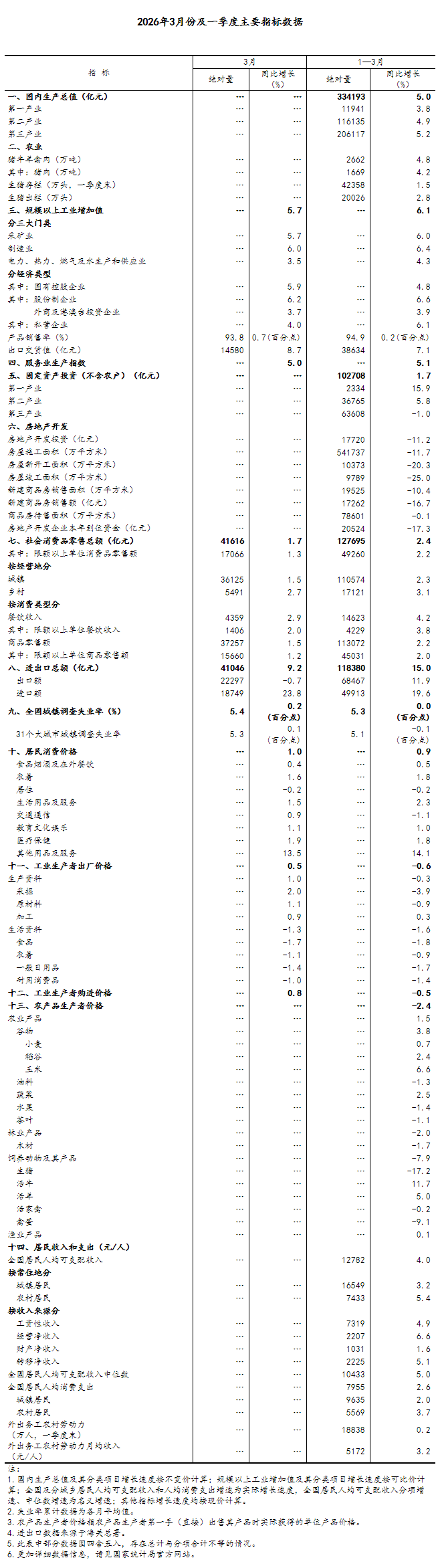 (2)根据季节调整模型自动修正结果,对近一年来各期国内生产总值、规模以上工业增加值、固定资产投资(不含农户)、社会消费品零售总额环比增速进行修订。修订结果及2026年一季度GDP环比数据、2026年3月份其他指标环比数据如下: