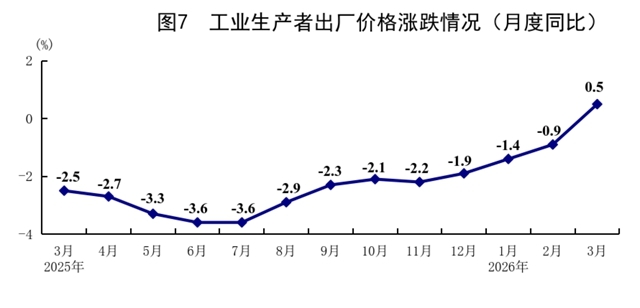 一季度,全国工业生产者出厂价格同比下降0.6%,降幅比上年四季度收窄1.5个百分点。其中,3月份同比上涨0.5%,上月为下降0.9%;环比上涨1.0%。一季度,全国工业生产者购进价格同比下降0.5%。其中,3月份同比上涨0.8%,上月为下降0.7%;环比上涨1.2%。