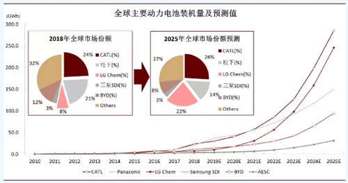 从2017-2018年营收结构来看,三星侧重消费与储能,LG Chem侧重动力及储能,松下逐步淡出消费专注动力,CATL则专注动力并拓展储能。展望2025年,我们认为动力领域CATL与LG Chem有望占优,2025年市场份额可分别达26%与22%,消费领域三星等继续占主导。