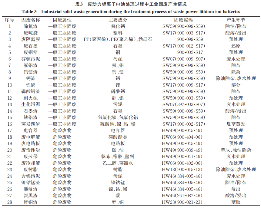 当前我国废旧动力锂离子电池三元材料的回收工艺以湿法冶金为主,材料修复法和火法冶金为辅,磷酸铁锂材料回收以材料修复法为主,少部分采用火法冶金回收工艺。5 种回收工艺(按工艺路线划分)的固废产生情况如表3所示。